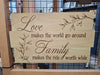 Celebrate what matters most with this beautifully crafted wooden laser-engraved sign. Measuring 11x16", it features the heartfelt message "Love makes the world go around, Family makes the ride worth while"—a timeless reminder of life's greatest treasures. Perfect for your home, this piece combines meaningful sentiment with elegant design, making it an ideal gift for loved ones or a cherished addition to any room. Let this sign inspire daily gratitude for the bonds that define us.