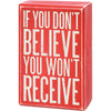 Transform your space with this inspiring box sign that reminds you of the power of belief. The meaningful message "If You Don't Believe You Won't Receive" serves as a daily affirmation, encouraging a mindset of possibility and manifestation. Ideal for bedrooms, offices, or living areas, this decorative piece combines thoughtful wisdom with rustic charm. Its compact design fits perfectly on shelves, nightstands, or desks, making it an excellent gift for anyone seeking motivation and positivity. Let this sign be your gentle reminder that faith and belief are the first steps toward achieving your dreams.