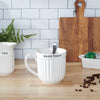 An oversized white stoneware mug featuring a debossed "Enjoy Today" sentiment. Features ribbed texture to add interest. Enjoy Today mug holds 27 oz. and is microwave, oven, dishwasher, and food safe. This item makes a perfect addition to a farmhouse aesthetic and coordinates well with other pieces in collection!